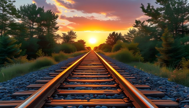 夕阳西下的铁路,伴随美丽的云彩与草木,展现自然的宁静与和谐。