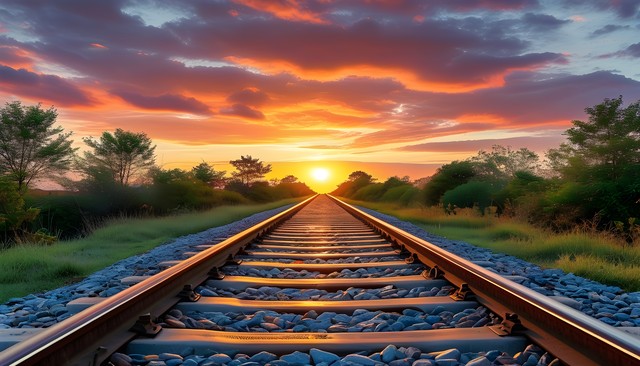 夕阳西下的铁路,伴随美丽的云彩与草木,展现自然的宁静与和谐。