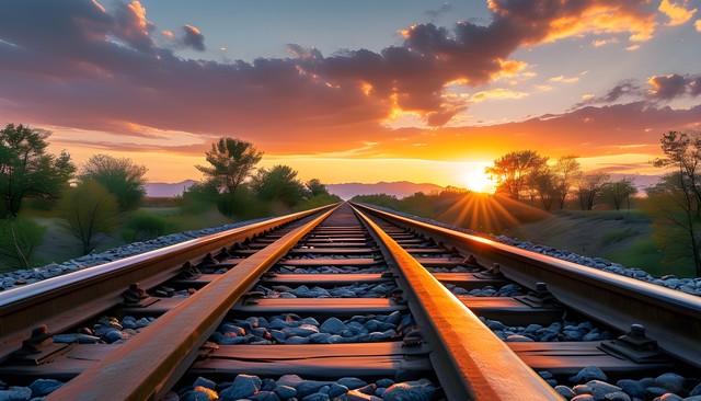 夕阳西下的铁路,伴随美丽的云彩与草木,展现自然的宁静与和谐。
