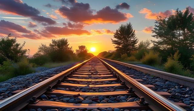 夕阳西下的铁路,伴随美丽的云彩与草木,展现自然的宁静与和谐。