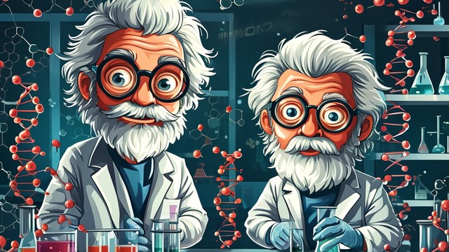 一幅卡通盲盒风格插画,两个科学家在实验室中忙碌,基因链环绕四周。