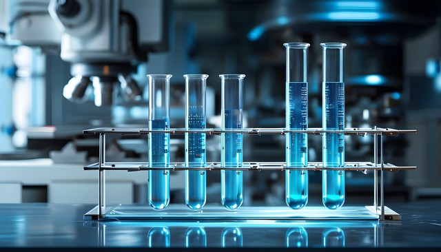 实验室中先进的透明试管和设备,呈现出科技感的蓝色调。