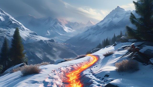 雪山与熔岩相间的奇幻景象,展现了自然的对比之美。