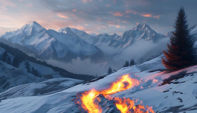 雪山与熔岩相间的奇幻景象,展现了自然的对比之美。