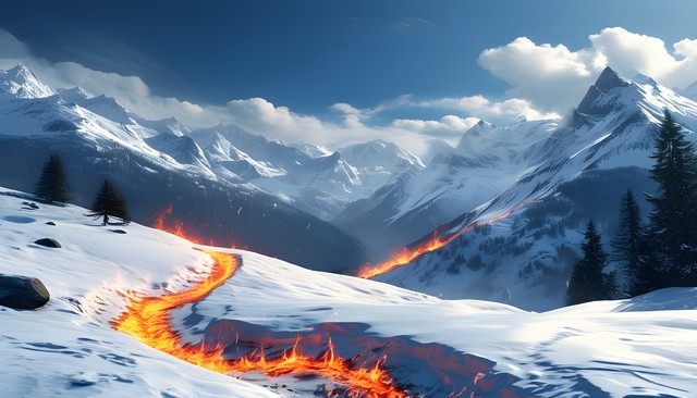 雪山与熔岩相间的奇幻景象,展现了自然的对比之美。