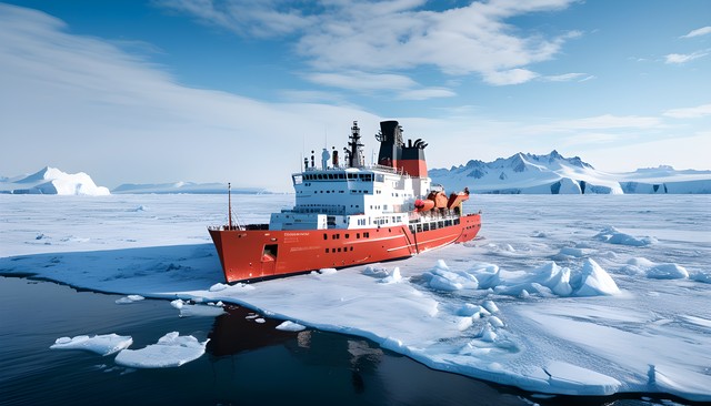 一艘红色的冰breaker船在冰雪覆盖的海面上航行,背景是蓝天和冰山。