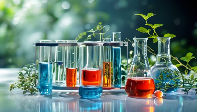 实验室中的试管和烧瓶,展示各种颜色的液体与植物的结合。