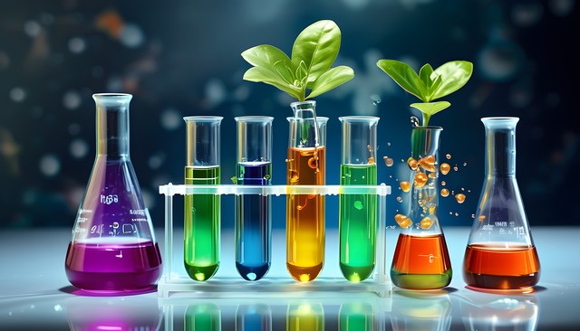 实验室中的试管和烧瓶,展示各种颜色的液体与植物的结合。