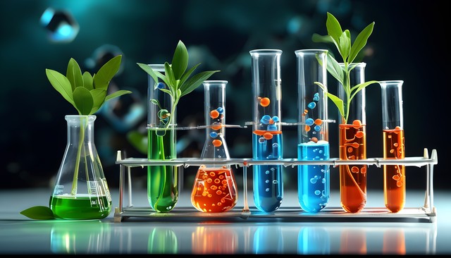 实验室中的试管和烧瓶,展示各种颜色的液体与植物的结合。