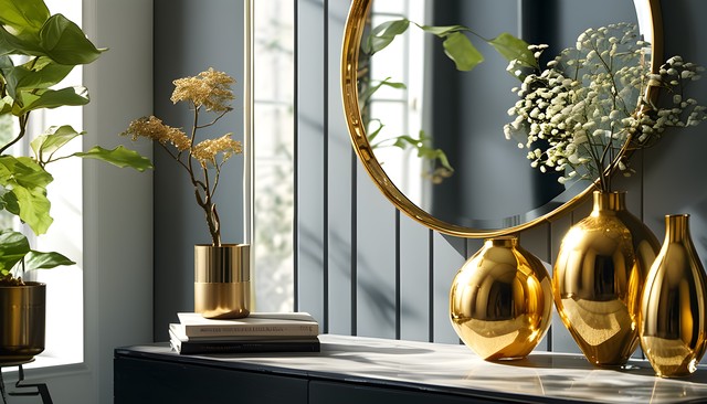 金色装饰、镜子与自然元素的和谐搭配,展现出优雅的室内风格。