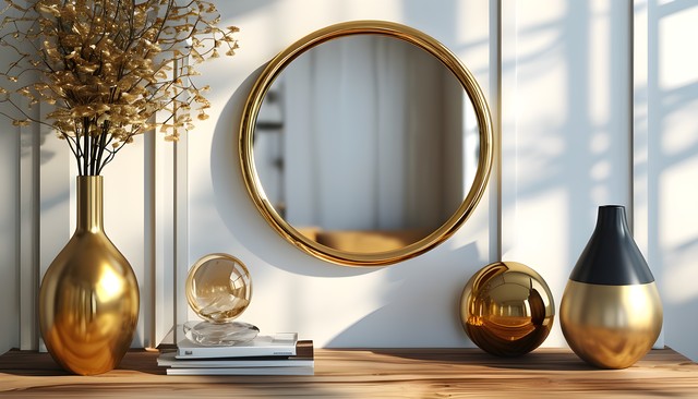 金色装饰、镜子与自然元素的和谐搭配,展现出优雅的室内风格。