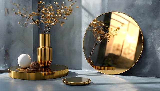 金色装饰、镜子与自然元素的和谐搭配,展现出优雅的室内风格。