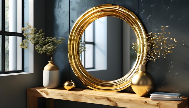 金色装饰、镜子与自然元素的和谐搭配,展现出优雅的室内风格。
