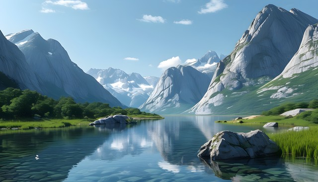宁静的湖泊与巍峨的山脉倒影,青翠的植被点缀其间,彰显自然之美。