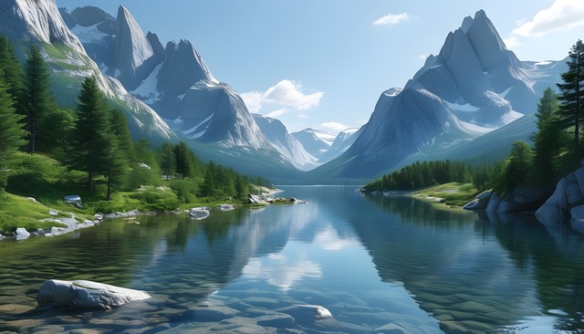 宁静的湖泊与巍峨的山脉倒影,青翠的植被点缀其间,彰显自然之美。