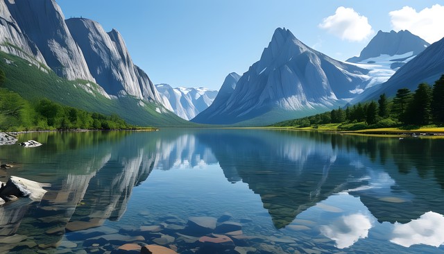 宁静的湖泊与巍峨的山脉倒影,青翠的植被点缀其间,彰显自然之美。