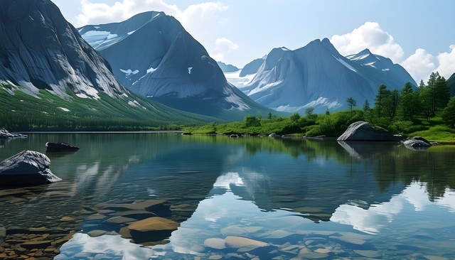 宁静的湖泊与巍峨的山脉倒影,青翠的植被点缀其间,彰显自然之美。