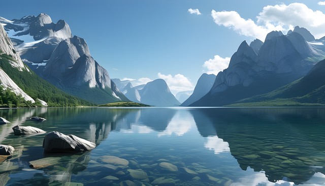 宁静的湖泊与巍峨的山脉倒影,青翠的植被点缀其间,彰显自然之美。