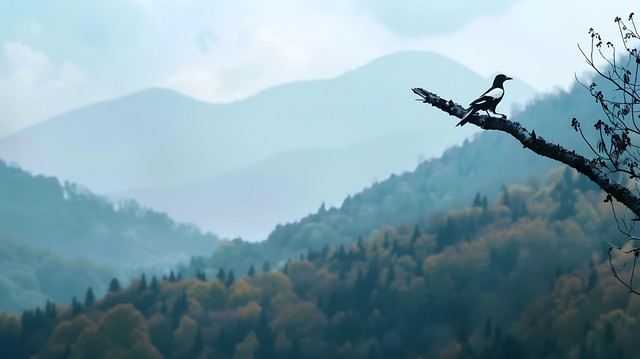 一只鹊在山间的树枝上栖息,远处的山景和森林背景为它的羽毛提供了自然的衬托。