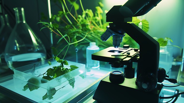 植物病理学家在实验室里使用显微镜观察植物组织中的病变,分析病害的细胞学特征。
