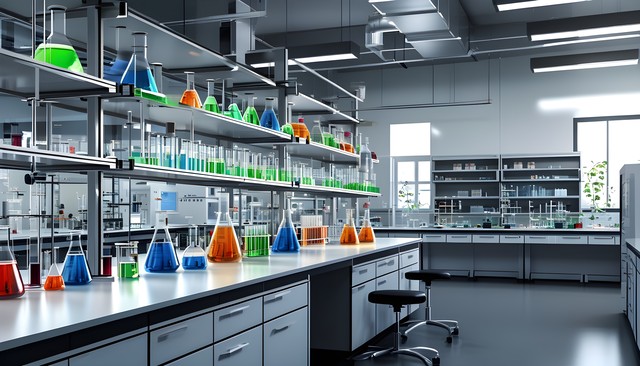 现代化实验室,玻璃器皿和实验设备整齐排列,桌面整洁。