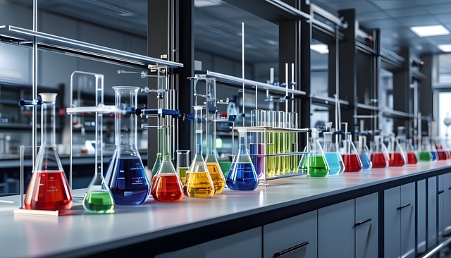 现代化实验室,玻璃器皿和实验设备整齐排列,桌面整洁。
