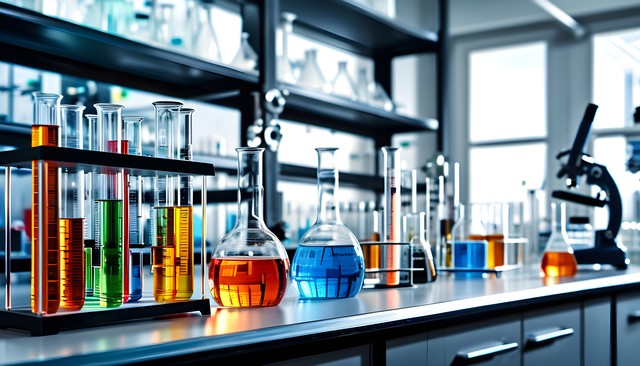 实验室台面上各种颜色的化学试剂瓶及实验器具,展现科学研究场景。