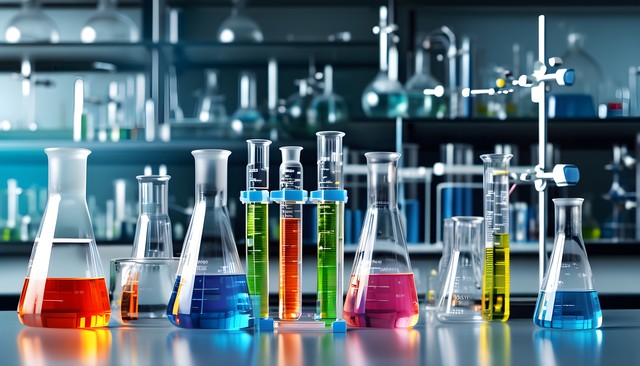 实验室台面上各种颜色的化学试剂瓶及实验器具,展现科学研究场景。