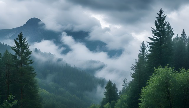 雾气环绕的山脉与密林构成的宁静自然景观。