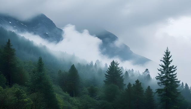 雾气环绕的山脉与密林构成的宁静自然景观。
