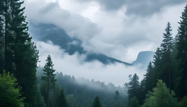 雾气环绕的山脉与密林构成的宁静自然景观。
