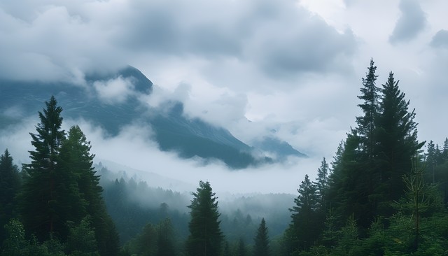 雾气环绕的山脉与密林构成的宁静自然景观。