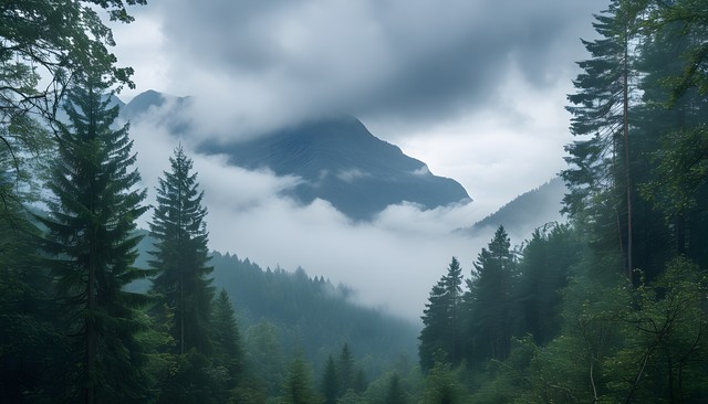 雾气环绕的山脉与密林构成的宁静自然景观。