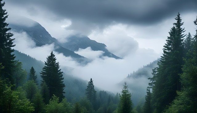 雾气环绕的山脉与密林构成的宁静自然景观。