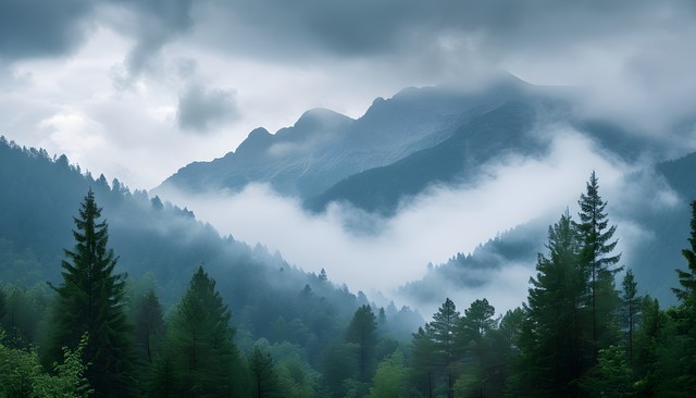 雾气环绕的山脉与密林构成的宁静自然景观。