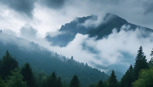 雾气环绕的山脉与密林构成的宁静自然景观。
