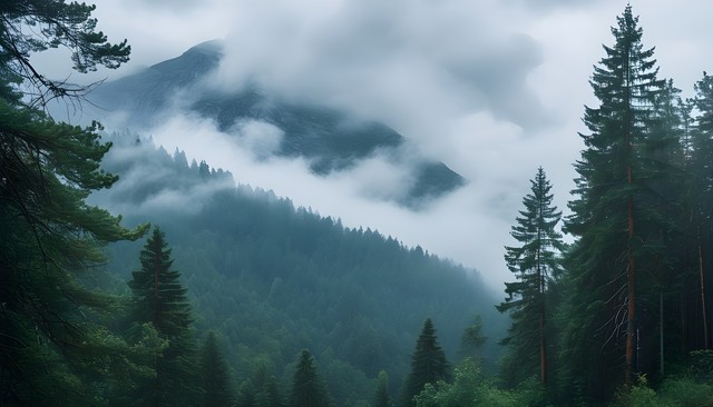 雾气环绕的山脉与密林构成的宁静自然景观。