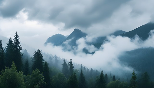 雾气环绕的山脉与密林构成的宁静自然景观。