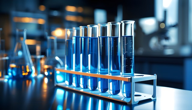 实验室中一排装有蓝色液体的试管