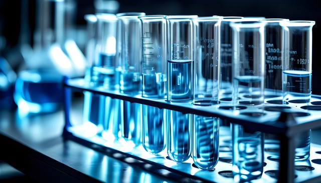 实验室中一排装有蓝色液体的试管