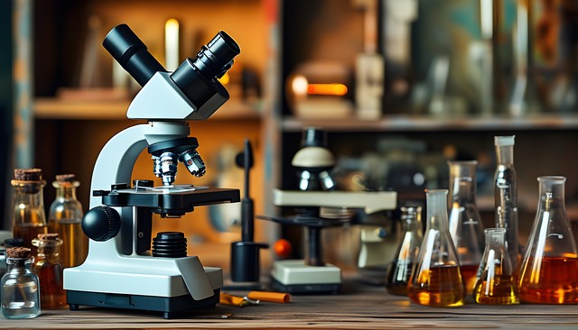 显微镜与实验器材的实验室桌面场景,植物和药剂瓶环绕。