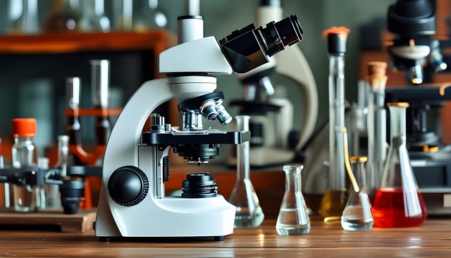 显微镜与实验器材的实验室桌面场景,植物和药剂瓶环绕。