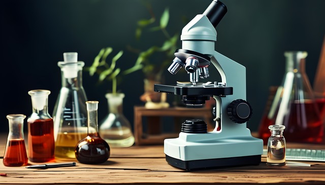 显微镜与实验器材的实验室桌面场景,植物和药剂瓶环绕。