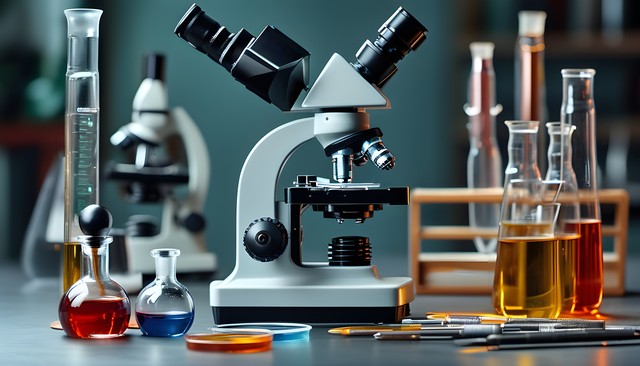 显微镜与实验器材的实验室桌面场景,植物和药剂瓶环绕。