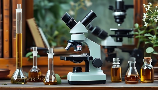 显微镜与实验器材的实验室桌面场景,植物和药剂瓶环绕。