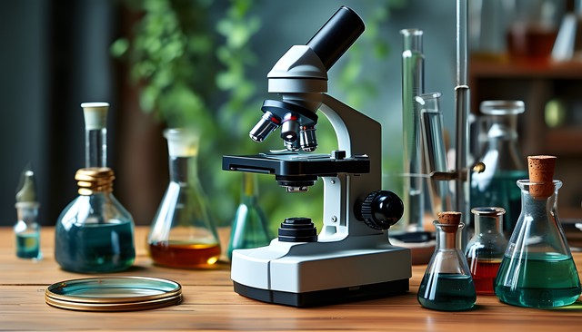 显微镜与实验器材的实验室桌面场景,植物和药剂瓶环绕。