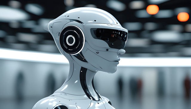 未来科技感十足的机器人头部特写,展示了精密的内部结构和光泽的外壳。
