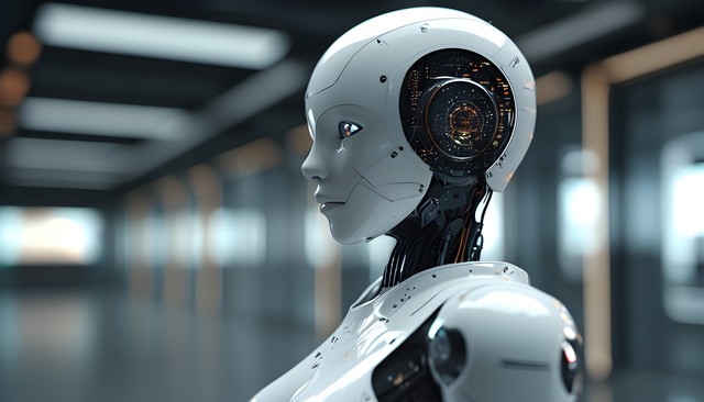 未来科技感十足的机器人头部特写,展示了精密的内部结构和光泽的外壳。