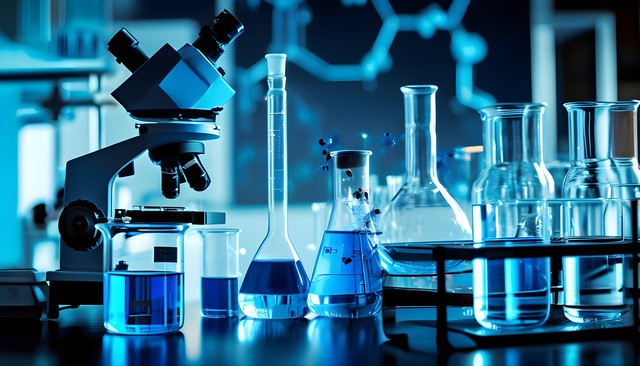 实验室中的显微镜和三种不同颜色的液体试管,展示科学研究环境。