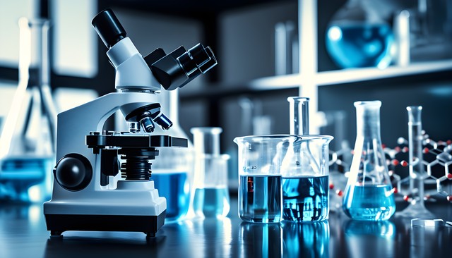 实验室中的显微镜和三种不同颜色的液体试管,展示科学研究环境。